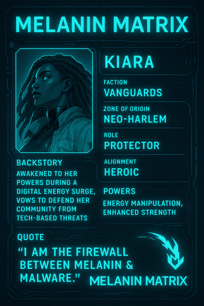 Name: Kiara Faction: Vanguards Zone of Origin: Neo-Harlem Role: Protector Alignment: Heroic Powers: Energy manipulation, Enhanced strength, Digital awareness Signature Glow: Electric cyan
