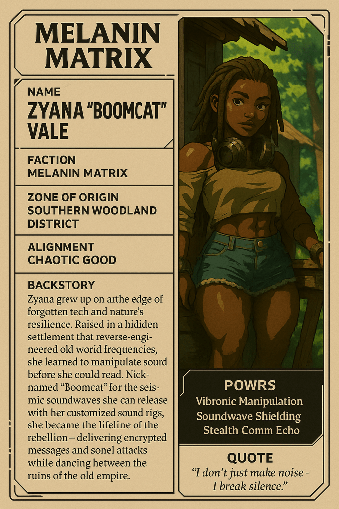 Born into the Southern Woodland District, Zyana wasn’t raised like most. Her people survived off-grid, sustained by wisdom passed down through oral lore and wave-borne resistance. Their weapon? Sound. Frequencies that could scramble trackers, disarm drones, or collapse buildings if tuned just right.