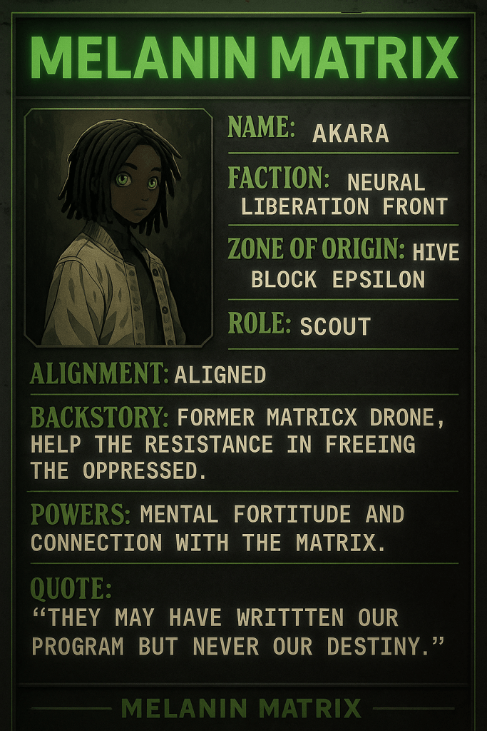 She fled into the underlayers, finding refuge with the Neural Liberation Front—a radical resistance movement of hackers, mystics, and reprogrammed minds. With help, Akara awakened her own consciousness. She retained every surveillance skill, every pathway, every systemic blind spot—and repurposed them.