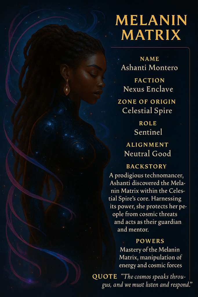 Whether guiding orphaned star-children through black hole echoes or mentoring young technomancers in the Spire’s lower rings, Ashanti became more than a Sentinel. She became a myth. A mentor. A mirror for what humanity could be when it aligned with the universe’s natural rhythm.