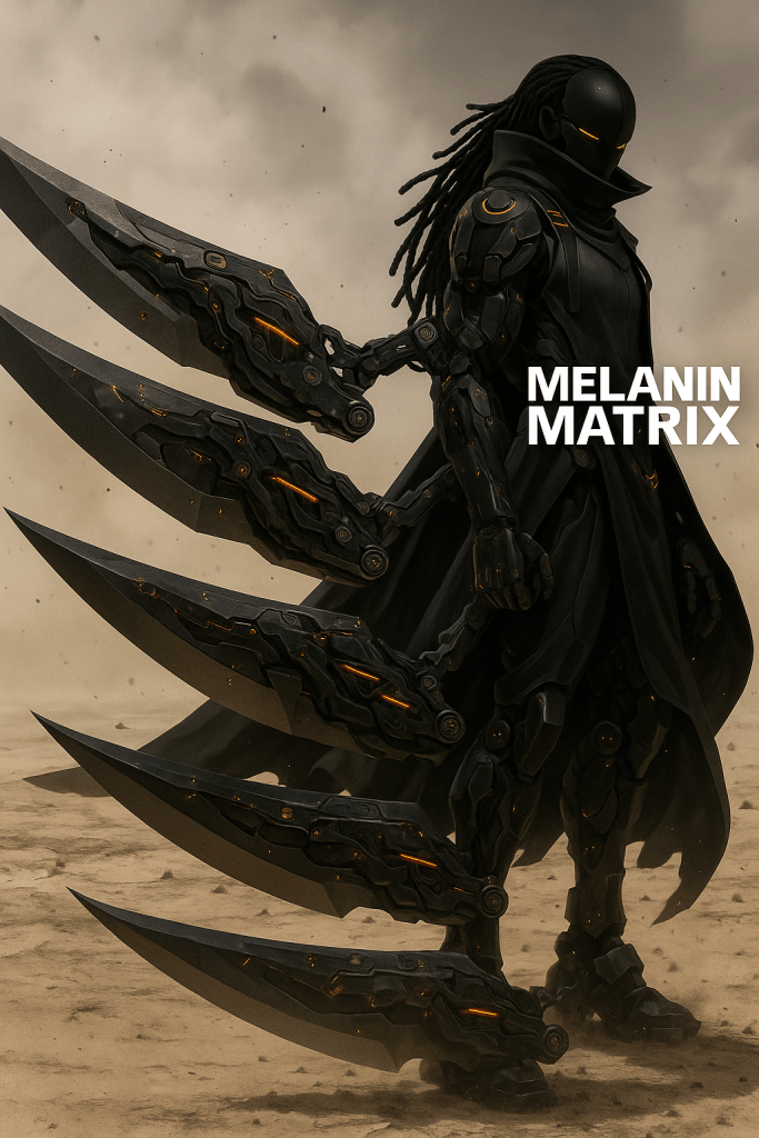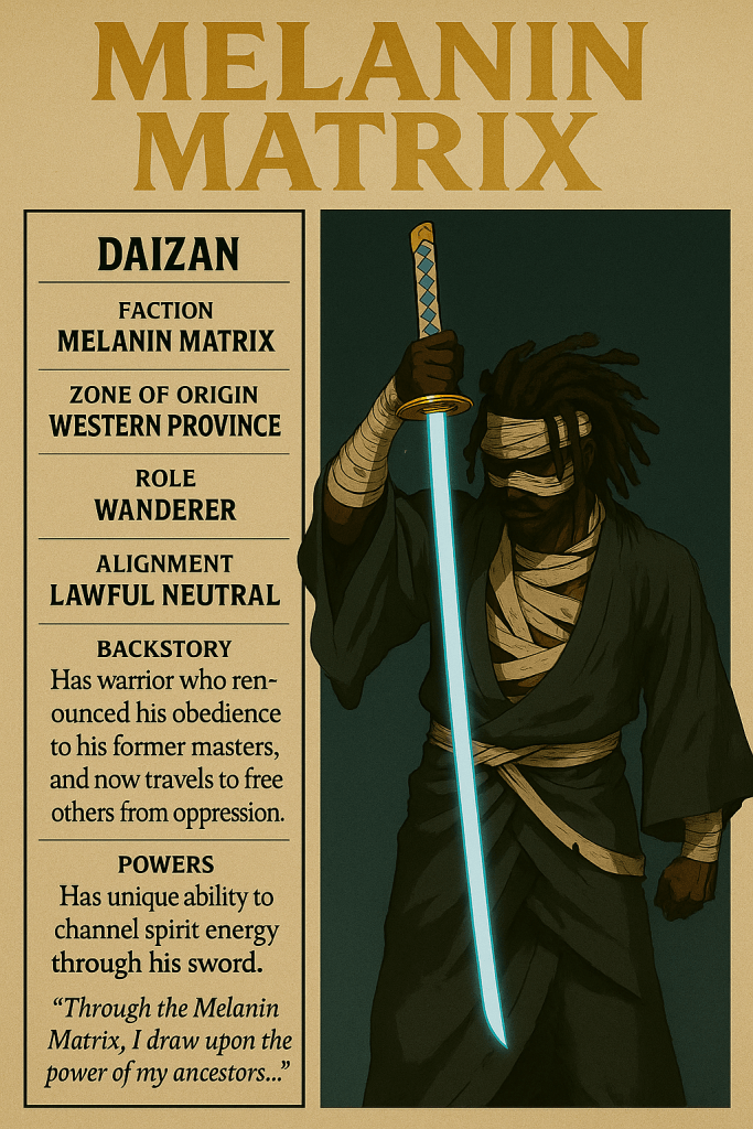 He is bonded to the Melanin Matrix, a metaphysical current flowing through bloodlines scarred by struggle but rich in spirit. Through this divine network of ancestral energy, Daizan wields his spirit blade—a glowing katana that channels not just power, but purpose. The energy it radiates is a blend of memory and might, allowing him to tap into the guidance of those who came before: warriors, healers, rebels, sages.