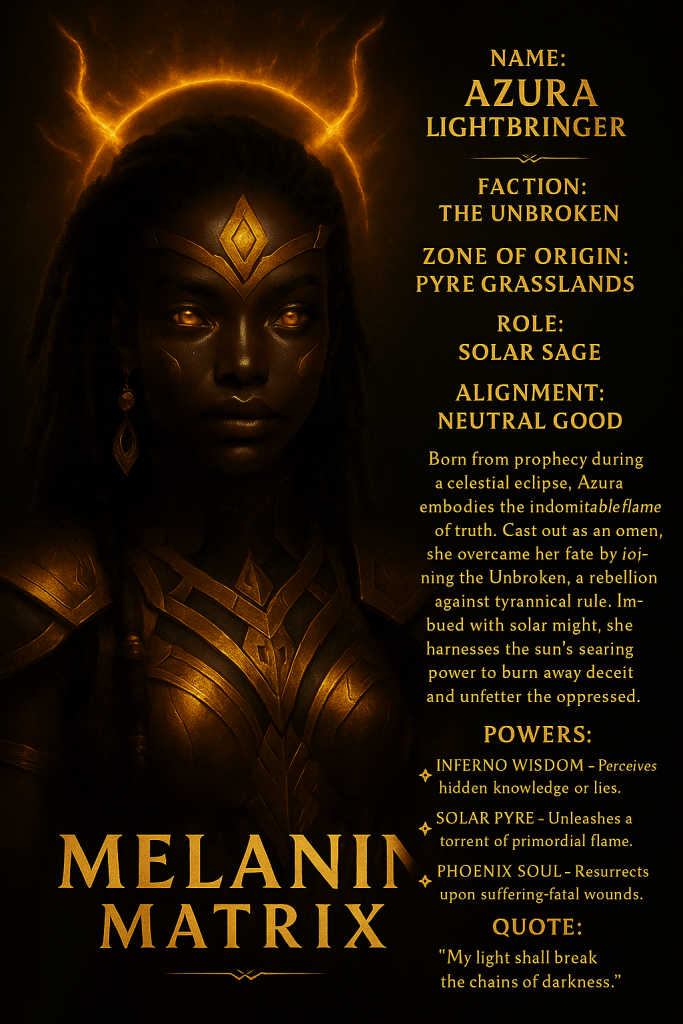 Raised in seclusion within the outer Pyre Grasslands, Azura grew up on the fringes of society, both revered and feared by her village. The Elders tolerated her presence, but the Dominion—a cold, mechanized regime that ruled the southern zones of the Melanin Matrix—labeled her a security risk at birth. They believed she was part of the ancient prophecy: The One Who Sees Through Flame.