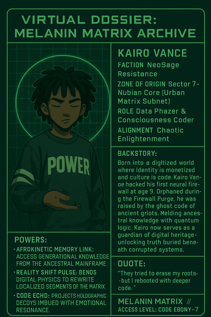 Kairo Vance, codename Powerborne, was born into a system where melanin meant metadata and ancestral knowledge was stored on blacklisted servers. Sector 7’s Nubian Core wasn’t just a zone—it was a battlefront. The Urban Matrix Subnet pulsed with hidden archives and ghost signals of forgotten legacies.