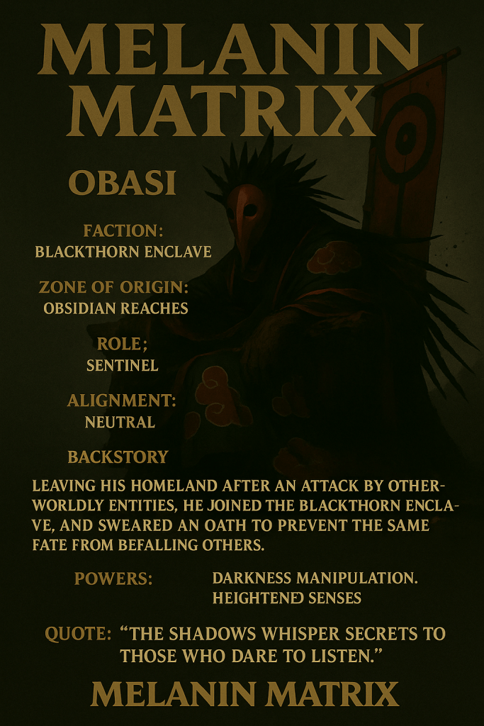 Clad in robes stitched with the sigils of ancient protectors and a mask carved from a dying elderwood tree, Obasi wandered the shattered lands until he reached the Blackthorn Enclave, a hidden fortress of warriors, mystics, and exiles who stood against chaos. There, he swore an oath beneath the Eternal Eclipse: to ensure that no soul suffers as his people had.