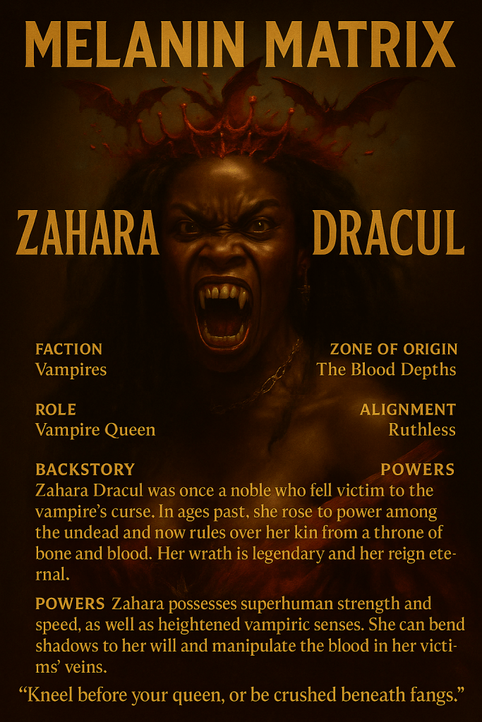 The vampire clans, once scattered and infighting across the Matrix, bent the knee to her without hesitation. They recognized not only her power, but her inevitability. She became their sovereign, their divine mother, their crimson queen. Under Zahara’s rule, the Vampires united for the first time in centuries. Her empire was built not on fear—but on absolute, unchallenged dominance.
