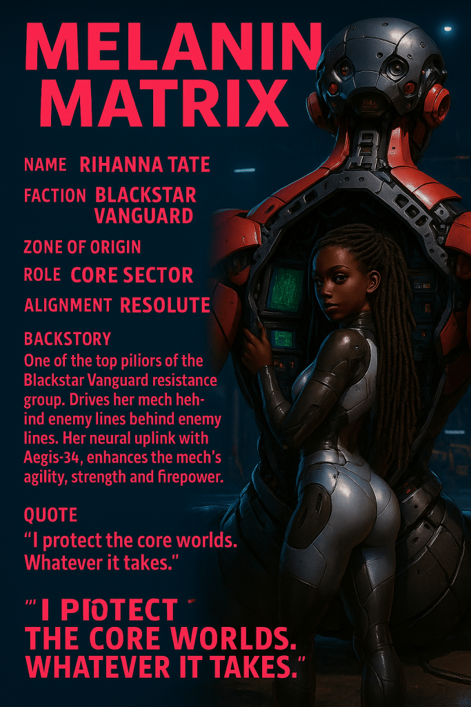 Now, she stands as one of the top pilots of the Blackstar Vanguard resistance force. Her bond with Aegis-34, a titan-class mech designed for infiltration and elimination, is more than mechanical—it’s spiritual. Her neural uplink doesn’t just control the machine—it dances with it. Her thoughts are its movements. Her rage is its power core.
