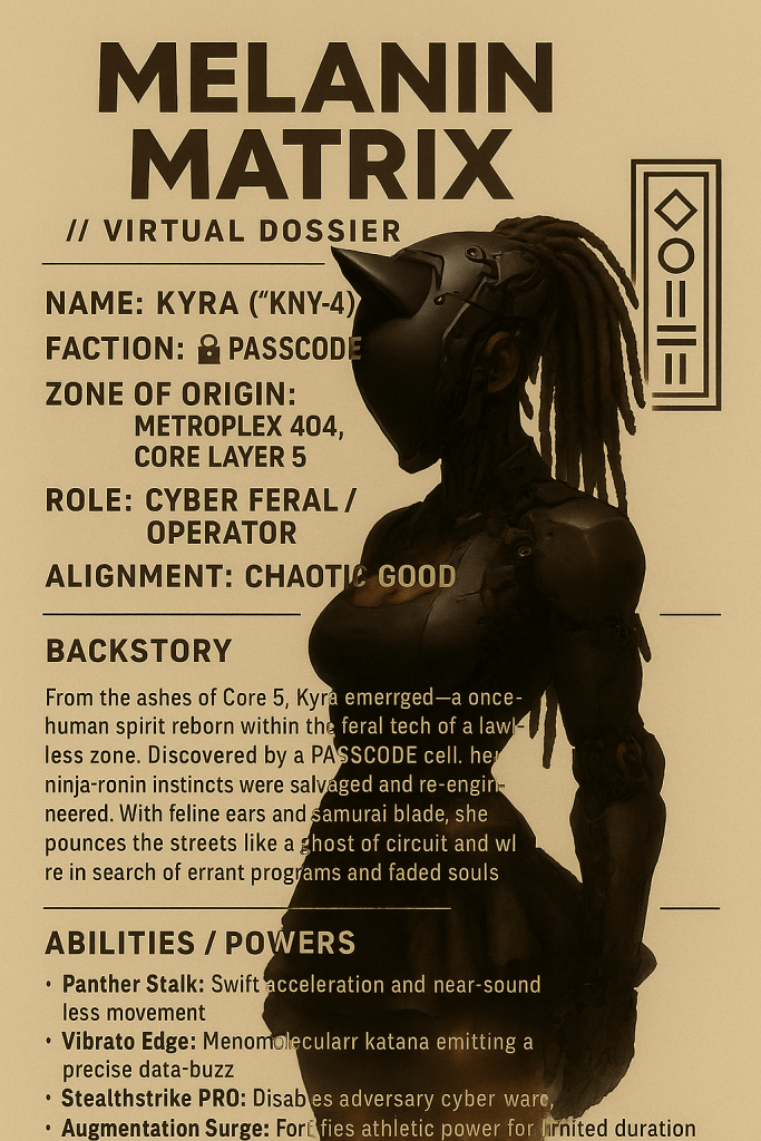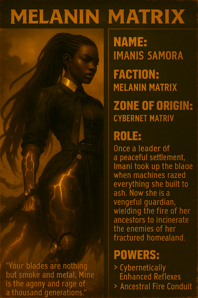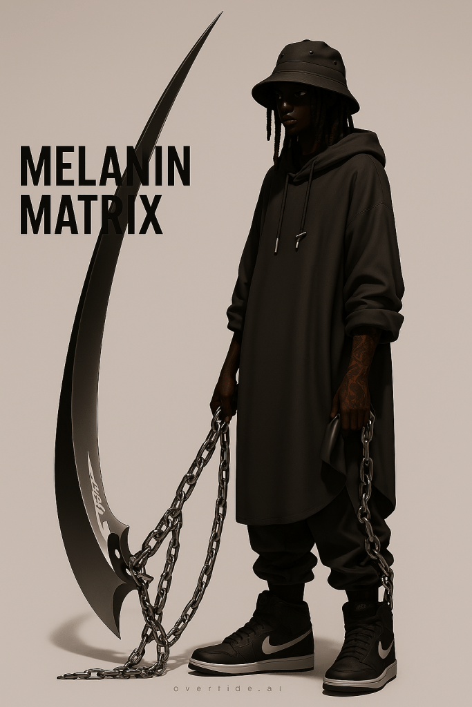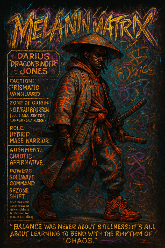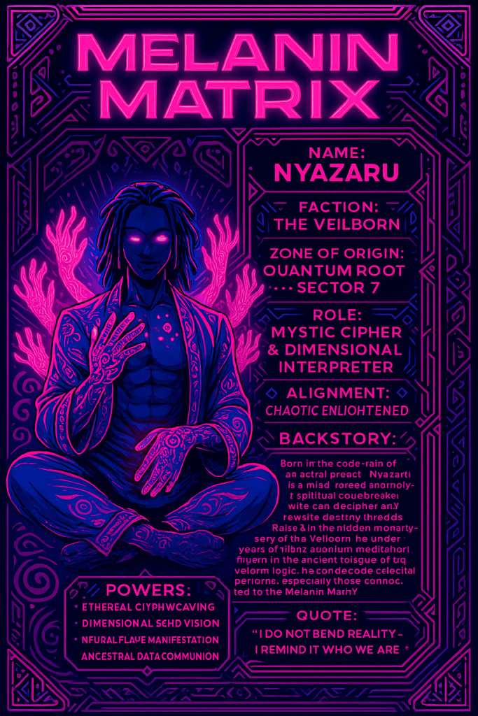 He fights not for power, nor praise, but for balance—for the voices that were erased, for the blood that built this city, for the ancestors who still speak in data and dreams.