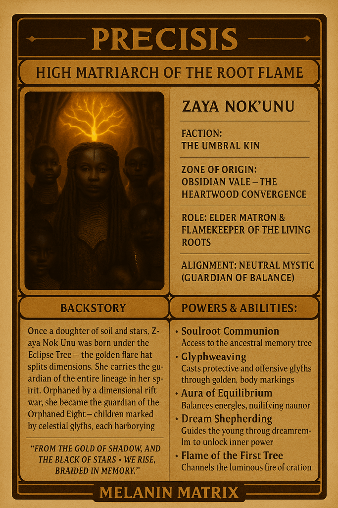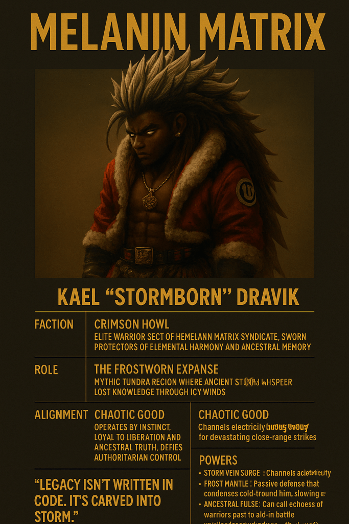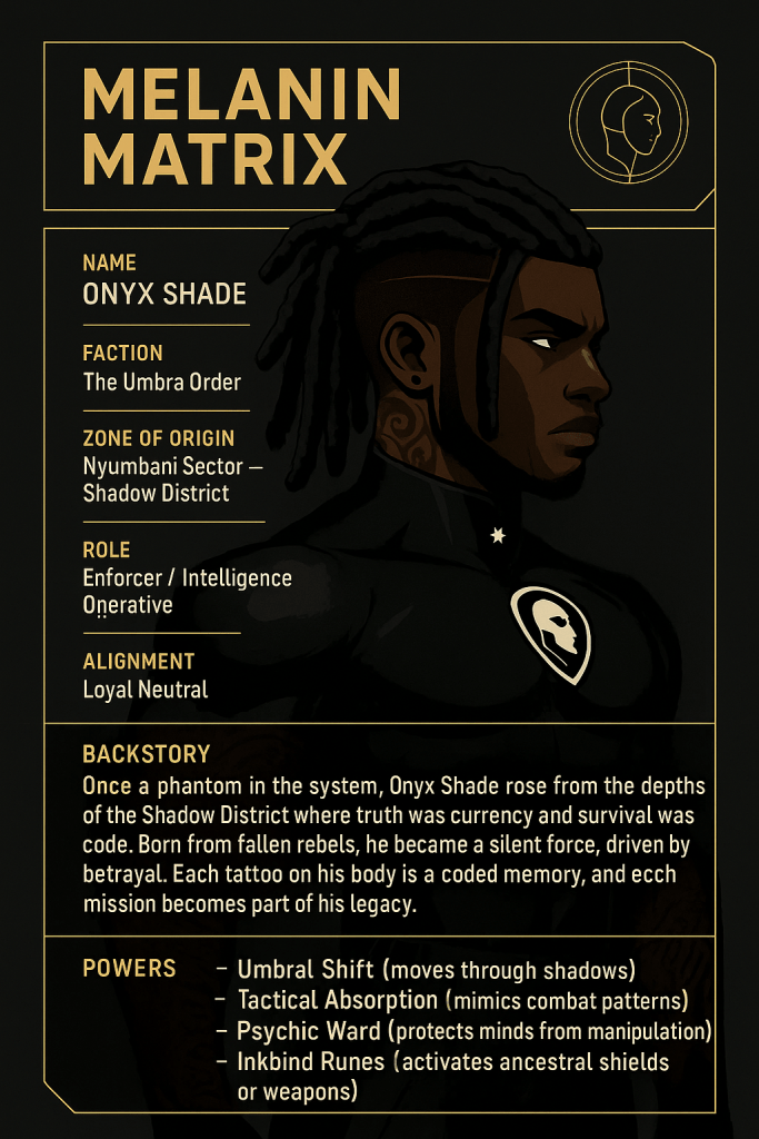 Onyx’s body is a tapestry of encrypted runes—Inkbinds that awaken through neural pulses and spiritual alignment. Each tattoo is a memory, a story, a code, a weapon. His dreadlocks are woven with nanothreads that record battlefield data and synchronize his mind with the frequency of the Umbra relics.