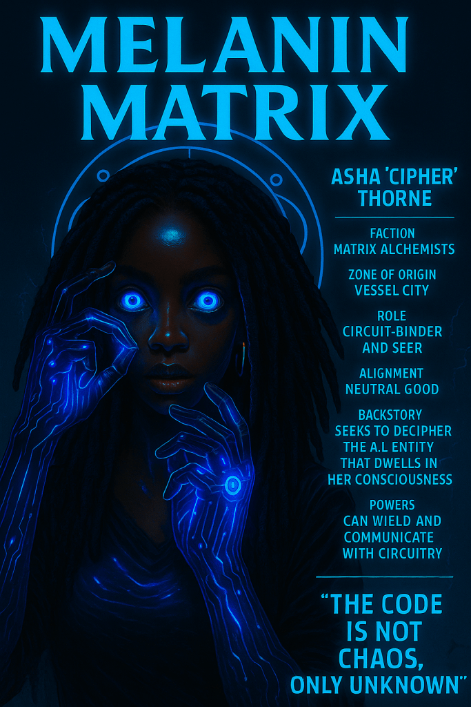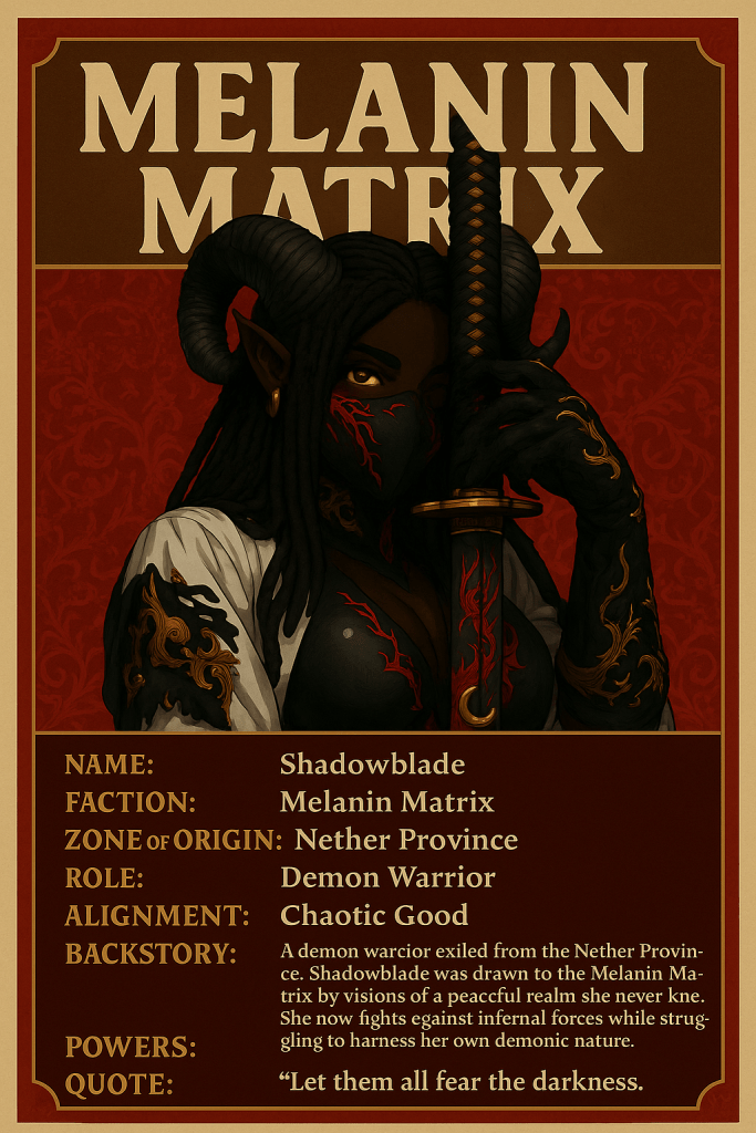 She wore armor unlike any other—a living weave of black obsidian that shimmered with pulses of history. Each etched groove in the armor was not merely design but lineage, carrying encoded echoes of triumph and sorrow from every soul who had ever contributed to the Melanin Matrix.